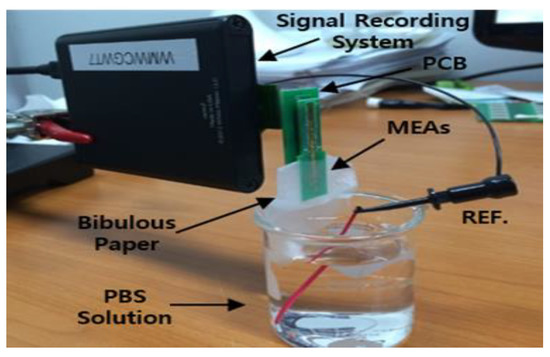 The functionality and reliability of the proposed MEAs were investigated using the insertion of a suspended device in phosphate-buffered saline (PBS) solution, as shown in Figure 5, which improved electrical conductivity and helped to form the circuit. The electric signal of each individual channel was characterized by EIS. The measurement setup of the proposed MEAs was comprised of a signal recording system, bibulous paper, assembled MEAs as working electrodes, PBS solution, and a counter electrode.