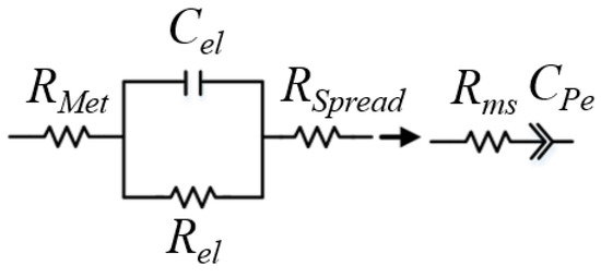 Whenever metal is immersed in an electrolyte, an excess concentration of electrons forms on its surface. The interface between electrode and electrolyte remains electrically neutral, and a cloud of ions form in the electrolyte adjacent to the electrode surface [21]. When an alternating signal is applied at the input of the MEAs, the generated electrons start accelerating through the electrode surface and a charge transfer resistance is induced. The accelerated electrons overcome the ohmic resistance of bulky Cr/Pt electrodes, before reaching an electrode-electrolyte double-layer junction. The whole testing environment can be described through Randles circuit analysis, as shown in Figure 6. The Randles circuit is comprised of a charge-transfer resistor Rel parallel with a double layer capacitor Cel, in series with an equivalent resistor of electrolyte RMet and electric circuit path RSpread. Due to the existence of a very large capacitance of Cel, Rel is assumed to be small in relation and can be neglected for the further study. The modified circuit is represented with a constant phase element capacitance CPE and a circuit resistance Rms.
