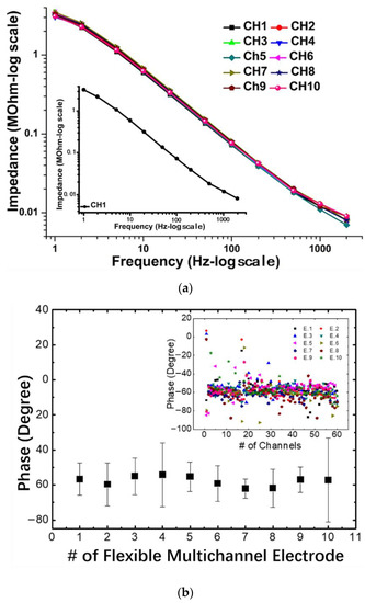 The impedance measurement of the individual channel of each MEA is important to analyze the signal to noise ratio [23]. The mean value of the measured impedance with an error bar for 10 randomly selected channels in the frequency range from 1 Hz to 2 kHz is shown in Figure 7a. The obtained results of randomly selected channels indicate the impedance magnitude of 145.6 ± 5.4 kΩ at 100 Hz and 12.3 ± 0.675 kΩ at 1 kHz, respectively. The phase angle was characterized at the frequency of 1 kHz, and measurements were performed for 10 MEAs. The average phase angle exhibited −57.85 ± 2.77 degrees, as represented in Figure 7b. This fruitful outcome proves a high consistency with excellent signal to noise ratio and high functionality of each individual channel in assembled MEA. Moreover, each tested channel operates efficiently with no short-circuiting or interference. However, the measured impedance results of all 10 channels were almost the same up to 1 kHz, and a slight difference emerged between 1 Hz to 2 kHz. The obtained results indicate a high correlation among 10 channels that verify the reliability and effectiveness of the advanced micro-fabrication process.