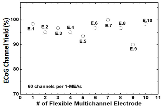 The reliability of a device is vital for the feasibility of mass-production. It also provides a guarantee for high yield and cost-effectiveness. The reliability of the fabricated MEAs was evaluated through a driven response, giving measured impedance results. The ECoG channel yield of 10 MEAs with all 60 channels is shown in Figure 8. Measurement data for 10 randomly selected MEAs with all 60 channels was recorded under a laboratory testing environment, and, afterward, the impedance results of each MEA were statistically obtained. The reduction in channel yield occurred due to fabrication failure, leakage through the polymeric encapsulation, or electric short circuit. An impedance less than 15 kΩ was considered the criteria for normally operated MEA channels versus rejected channels. The maximum ECoG channel yield of 100% was obtained at E.7, and a minimum channel yield of around 91% was observed at E.9. Based on the overall statistical data, over 90% of channels in single MEA were normally operated, which proves the excellent reliability and feasibility of the fabricated MEAs. The proposed wafer-scale fabricated MEAs are cost-effective due to high yield percentage and can be regarded as a promising candidate to assist more researchers and doctors for further understanding of the behavior of neural networks. Additionally, it also benefits patients to treat them with a cost-effective and less painful instrument.