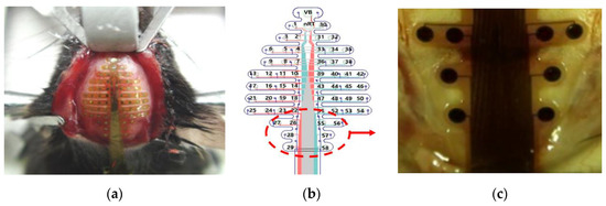 Images of the microelectrode: (a) Flexible MEAs mounted on the skull of an adult male mouse; (b) arrangement of the high-density mouse ECoG electrodes; and (c) microscopic photograph of the partially enlarged MEAs.