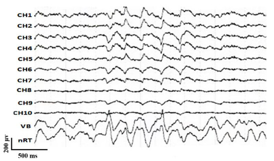 An in vivo test on the skull of a hybrid adult male mouse (C57BL/6J—129S4/SvJae hybrid mice (12–15 weeks old)) was conducted to measure brain signals. The mouse was anesthetized with a ketamine (120 mg/kg, i.p.) and xylazine (6 mg/kg, i.p.) cocktail. The effect of anesthesia was monitored during the entire testing. Under the anesthetic condition, the mouse was placed on the stereotaxic apparatus (David Kopf Instruments, Model 902, Tujunga, CA, USA). The ear bars were placed in the mouse’s ear canal and tightened carefully. The eyes were covered with biocompatible jelly (e.g., petroleum jelly) to protect them from drying under surgery light. Afterward, the mouse’s head was moisturized with 70% ethanol and the fur was shaved from the head. Subsequently, 2% lidocaine hydrochloride was injected for local anesthesia. The head was incised about 2.5 cm inside the scalp and the skin was pinched with micro-clamps (Fine Science Tools, Inc., 18052-03, Foster City, CA, USA) to keep the incision wide open. Later, the remaining tissues and membranes were removed from the skull by using sterilized cotton swabs. After that, the bregma point was marked and MEA electrodes were placed on the skull. The electrode array was swabbed clean with alcohol and kept completely dry in order to obtain a better adhesion with a mouse skull. The electrodes remained fixed on the skull, due to Van der Waals forces. A rigid stick was positioned on the middle of the head as a strut to connect the vertical connector with a strong glue, then the dental acrylic cement was applied over the skull and the backside of the connector plane. Subsequently, the micro-clamps were removed and the incised skin was sutured. After recovery, the electrodes could be connected to the headbox of a multichannel EEG amplifier system (Synamps2, Charlotte, NC, USA) via the connector and the recording was performed after 1 hour of habituation. The image of MEA electrodes placed on the mouse skull during in vivo test is presented in Figure 9a,c, respectively. The electrode array had a Christmas tree structure with 12 branches on each side, and each branch had several electrical contact points, covering the exposed skull in an evenly distributed manner (Figure 9b). It is observed that the MEAs were well-arranged and conformed to the skull. This precise implantation helped to record signals after the mouse was habituated. CH1-CH10 represents the output of 10 randomly selected channel electrodes out of 60 channels. The VB and nRT as shown in Figure 9b represent the data from two big electrodes used for grounding purposes.