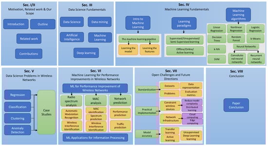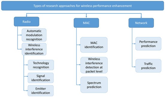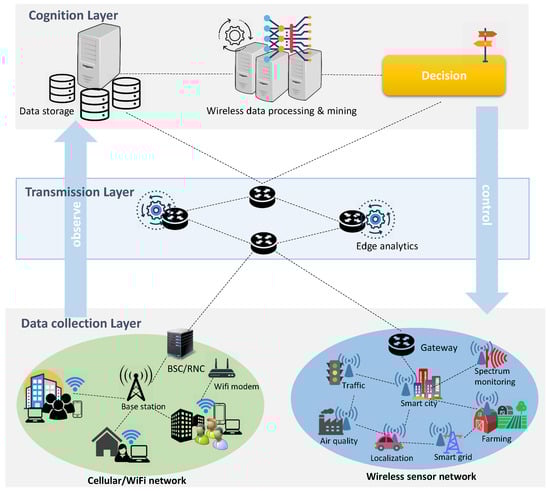 Science and the way we undertake research is rapidly changing. The increase of data generation is present in all scientific disciplines [1], such as computer vision, speech recognition, finance (risk analytics), marketing and sales (e.g., customer churn analysis), pharmacy (e.g., drug discovery), personalized health-care (e.g., biomarker identification in cancer research), precision agriculture (e.g., crop lines detection, weeds detection...), politics (e.g., election campaigning), etc. Until the recent years, this trend has been less pronounced in the wireless networking domain, mainly due to the lack of ‘big data’ and sufficient communication capacity [2]. However, with the era of the Fifth Generation (5G) cellular systems and the Internet-of-Things (IoT), the big data deluge in the wireless networking domain is under way. For instance, massive amounts of data are generated by the omnipresent sensors used in smart cities [3,4] (e.g., to monitor parking spaces availability in the cities, or monitor the conditions of road traffic to manage and control traffic flows), smart infrastructures (e.g., to monitor the condition of railways or bridges), precision farming [5,6] (e.g., monitor yield status, soil temperature and humidity), environmental monitoring (e.g., pollution, temperature, precipitation sensing), IoT smart grid networks [7] (e.g., to monitor distribution grids or track energy consumption for demand forecasting), etc. It is expected that 28.5 billion devices will be connected to the Internet by 2022 [8], which will create a huge global network of “things” and the demand for wireless resources will accordingly increase in an unprecedented way. On the other hand, the set of available communication technologies is expanding (e.g., the release of the new IEEE 802.11 standards such as IEEE 802.11ax and IEEE 802.11ay; and 5G technologies), which compete for the same finite and limited radio spectrum resources pressuring the need for enhancing their coexistence and more effective use the scarce spectrum resources. Similarly, on the mobile systems landscape, mobile data usage is tremendously increasing; according to the latest Ericsson’s mobility report there are now 5.9 billion mobile broadband subscriptions globally, generating more than 25 exabytes per month of wireless data traffic [9], a growth close to between Q4 2017 and Q4 2018!