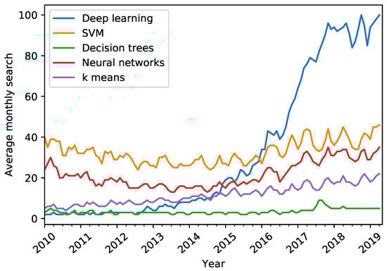 There is a growing interest in deep learning in the recent years. Figure 4 demonstrates the growing interest in the field, showing the Google search trend from the past few years.