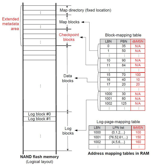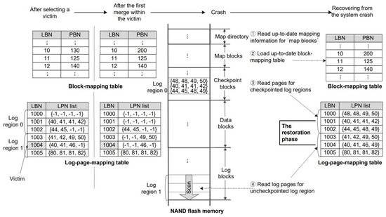 On the other hand, some researchers have addressed FTL-decoupled recovery schemes [8,10,11,21,22,23,24]. First, Lightweight Time-shift Flash Translation Layer (LTFTL) [11] is a page-mapping FTL with an internal recovery scheme. Whenever address mapping is changed, LTFTL keeps the changed address log on buffer in the RAM, and periodically, it performs checkpoints by writing a set of logs in the RAM to the log section of flash memory in a page unit. In this way, when a crash occurs, LTFTL can rapidly restore the latest address-mapping information through a small number of page accesses to flash memory. Since FAST uses a page-mapping table for log blocks, it seems that this logging approach with checkpoint can be applied to FAST. However, there exist the following problems. First, due to the limited size of the log section, FAST cannot store all the log records under an environment where many updates in the address mapping are occurring. To solve this problem, whenever the overall size of the current log records exceeds a given threshold value, FAST dumps up-to-date page-mapping information to the flash memory. Unfortunately, this incurs performance degradation. Second, as system failure may occur during each step of the merge operation of FAST, to guarantee the system’s safety, the corresponding log records should be flushed to flash memory, although the total size of all log records does not reach the page size. These flush operations result in not only low space utilization in the log section area but also performance degradation.