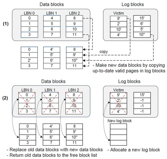 Figure 2 shows how to perform the merge operation in FAST. In step (1), the victim log block contains valid pages belonging to three different data blocks, that is, LBN 0, 1, and 2 (we assume that a block is composed of four pages). Thus, three merge operations will proceed. In the figure, the merge operation for the data block of LBN = 2 makes a new data block to which all latest valid pages, that is, 8, 9′, 10′′, and 11 are copied. After three merge operations are completed, like step (2), old data blocks taking part in the merges are replaced with new data blocks by changing the block-mapping table. Then, the old data blocks are returned to the free block list and a new log block is allocated to the buffer of log blocks and the log-page-mapping table is changed. Furthermore, the victim log block is returned to the free block list.
