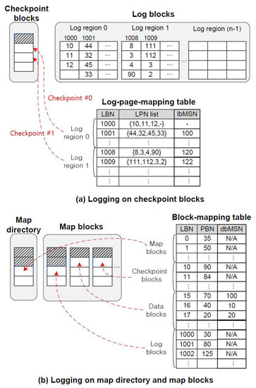 As shown in Figure 3a, the log blocks are logically divided into several log regions. The size of a log region is determined by how much information in the log-page-mapping table is packed up into a page. After pages in the log blocks belonging to the first log region are all used by a sequence of writes from the upper file system, part of the log-page-mapping table corresponding to this log region is output to the checkpoint block area. For the rest of the log regions, the same actions are done one after another. This checkpoint approach is different from the strategy that involves all information in the log-page-mapping table being flushed out whenever an update happens to this table. It may be impossible to adopt the latter approach in a large-scale storage system since a large log-page-mapping table should be maintained, and accordingly, the cost of a flush-out is very expensive. The unit of a checkpoint is equivalent to the size of a log region, which is, as mentioned before, configured to guarantee a one-page write when outputting the metadata to the flash memory. Suppose that the size of a page is 4 KB, the size of a block is 512 KB [26], and the space size of an LPN value kept in the log-page-mapping table is 4 B. A page can keep about 1024 LPN values, and thus, a log region consists of eight log blocks, each of which has 128 pages. Since the last checkpoint, newly updated mapping information in the log-page-mapping table would be lost upon a system failure because it is kept only in the RAM, not persistently stored in flash memory. However, this lost information can be easily and promptly recovered during the crash recovery.