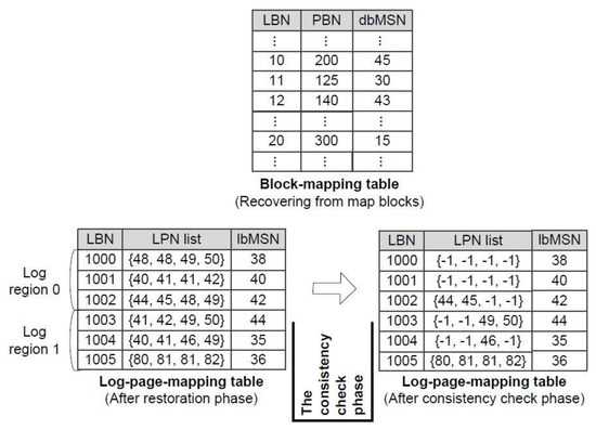 In the consistency check phase, FastCheck makes the temporary log-page-mapping table restored by the restoration phase consistent by invalidating log pages in the log-page-mapping table, if necessary. More specifically, it sets LPN values of invalid log pages as −1 in the log-page-mapping table. For reference, after a log block is chosen as the victim and multiple merge operations for the victim log block are executed, all the log pages in the log block area that participate in those merge operations have to be marked as invalid. That is, all the corresponding LPN values in the log-page-mapping table are set to be −1. For example, in the log-page-mapping table at the bottom-left of Figure 4, the current victim is the log block of LBN = 1004, where a merge operation for LPN = 40 and 41 is executed first. As a result of the merge, the LPN values of all the log pages belonging to the logical block of LBN = 10 are set to be −1.