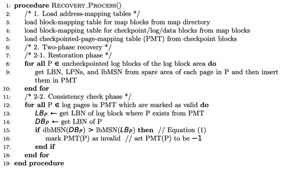 Choi [24] proposed a general-purpose FTL framework that includes a crash recovery module called Hierarchically Interacting Logs (HIL). HIL handles crash recovery through two phases of borrowing ideas from the database: structural recovery and functional recovery. However, our crash recovery technique is specialized for hybrid mapping FTLs and solves crash recovery through two phases, namely, the restoration phase and the consistency check phase.