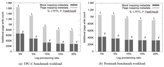 Figure 7 shows a comparison between the write overheads for logging using FastCheck and the LTFTL’s recovery methods during a normal execution period. We measured them by varying the rate of the log block area to flash memory from 3 to 20%. As shown in Figure 7a,b, in both cases, FastCheck clearly incurred a lower write overhead cost than the LTFTL’s recovery method. This is because FastCheck carries out the checkpoints for the log-page-mapping data using a relatively long checkpoint period, as shown in Equation (3). On the other hand, LTFTL needs to flush out log records in the RAM more frequently to ensure the correctness of the merge operations. In particular, with respect to the overhead due to the logging for the page-address-mapping information, LTFTL should perform more additional writes for the logging than FastCheck by 60 to 120 times.