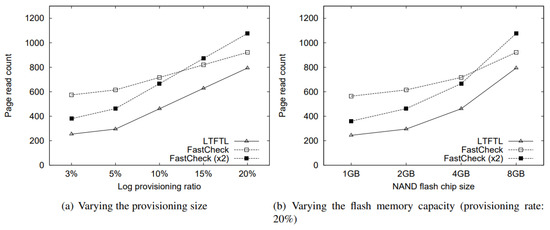 According to the above observation, FastCheck required much more recovery time than LTFTL’s recovery scheme under the configuration that the volume of a flash memory chip was not large enough and the provisioning log space size was small. This was because in Equation (6), the ratio of the time cost to read all the log pages that a log region manages, that is, Pfastcheck to the overall time cost was greater under such a configuration compared with the LTFTL’s recovery scheme. In order to reduce this cost during the recovery, we considered a faster checkpoint period, Pfastcheck, by reducing the amount of log pages that the log region managed. In Figure 8, we can see that when making the checkpoint period of FastCheck twice as fast, FastCheck revealed a small recovery time cost under the configuration above.