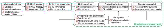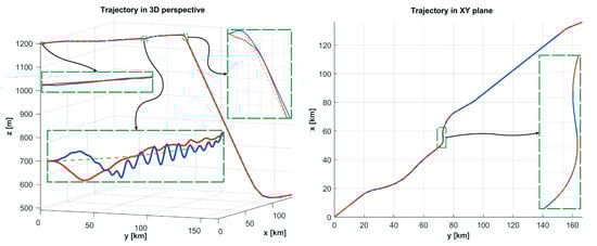 In relation to these systems, there are different aspects that play a key role in ensuring the aircraft’s proper motion, such as position detection techniques [23] or hardware implementation [24], but only theoretical investigation is proposed in this article. Furthermore, the navigation problem has been simplified by assuming that the state vector of the aircraft (positions, velocities, attitude, etc.) is completely known; in other words, it was defined as completely measurable. Therefore, the navigation system has not been implemented or simulated.
