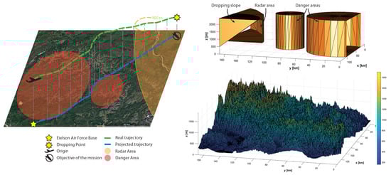 The F-86 Sabre, which began acting as a flight bomber during the Korean War (1950–1953) [59,60], was hypothetically modernized in order to enhance its military functionality. Nevertheless, this new technology has not yet been tested in this aircraft in autonomous bombing operations; therefore, the United States Air Force (USAF) has decided to conduct a mock blitz in the Center Eastern region of Alaska. The mission will consist of bombarding an uninhabited area close to the border with Canada at a minimum vertical distance of 200 m, starting from the Eielson Air Force Base at an altitude of 1200 m. The Sabre will have to face a radar with a minimum detection altitude of 900 m and two danger areas, with a maximum dropping slope of 2.