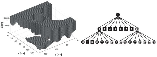 In Figure 3, an example of the application of the ACD algorithm to the complete space of study is shown. Moreover, the tree scheme used for the Octree decomposition is represented: The verified and non-verified collisions (black and white circles, respectively) were divided into eight new rectangloids, while the inclusions in the obstacles (black squares) were discarded. This scheme is based on [61].