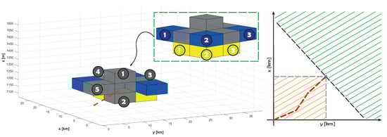 Regarding the neighborhood choice, the block subspaces located on the top, bottom, sides, and in front (gray) of the subspace are evaluated as neighbors (see Figure 4). Furthermore, three diagonal rectangloids (blue) are permanently available neighbors for improving the algorithm’s capabilities in the path-building process, while the other three on the bottom front, diagonal, and right sides (yellow) are introduced when the aircraft is close to the radar’s perimeter in order to facilitate the descent. If the UAV has already been to one of these possible subspaces, it is automatically eliminated from the list of destinations. Once the neighborhood has been obtained, the ACD algorithm is applied at each subspace, and afterward, the centers of all new rectangloids for which the rewarding function is used are calculated so as to choose the next most appropriate destination.