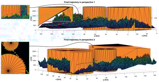The final reference trajectory, which is shown in Figure 5, offers acceptable flight conditions and avoids all imposed obstacles. However, this is not the best possible solution, and different combinations of weighting parameters should be selected to enhance the results.