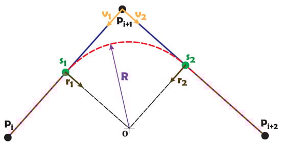 The algorithm is applied to each non-aligned group of three waypoints. In Figure 6, an example of the application of the radii of gyration is represented, in which points and are the tangential points among the arc and both lines, vectors , , , and are the tools utilized to define points and , as well the arc center (O), and R is the radius. The directions of vectors and are the result of the following vectorial product: .