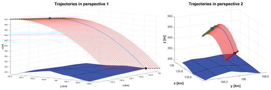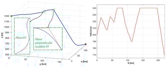 Regarding Algorithm 3, the first step consists of initializing the required variables: The path, yaw, and flight path angles obtained from the RRACD code; the maximum, minimum, and initial speeds in the velocity profile; the maximum positive velocity variation per meter (); the precision of the trajectory building (); the minimum load factor used at each curve (); the maximum allowed load factor () [40]; the vector . The vector contains the gradient of the load factor with respect to the yaw angle change (), so that when a change in takes place, an additional load factor is applied. Therefore, the formula for the load factor in the case of i is given by the expression: