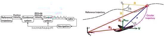 Thus, a proportional guidance law, together with the control techniques mentioned above, was chosen to evaluate and study the stability, tracking, robustness against perturbations, and complexity. Additionally, this law contained an improvement: Circular trajectories for the aircraft were imposed so as to avoid the issues of classical proportional laws; hence, it is referred to as a nonlinear guidance law (proportional guidance based on forces) from this point forth.