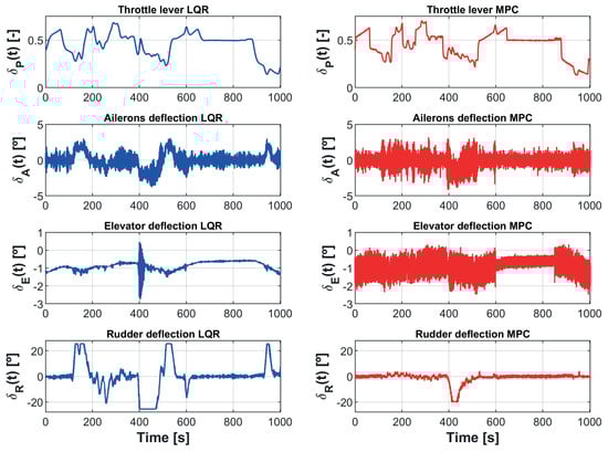 The aircraft, which actually acted as a UAV, had to conduct autonomous tracking of the reference “dynamic trajectory”, defined as a combination of the path in the 3D Cartesian coordinates and the velocity profile that the aircraft must follow, while actuators modified the deflection of the control surfaces and the activation of the throttle lever on the basis of sensor measurements. Only the rudder, ailerons, and elevators were taken into account; hence, the horizontal stabilizer was assumed to be fixed. All of the deflection and throttle lever amplitudes and rates, together with structural limitations and other parameters, were based on [39,40].