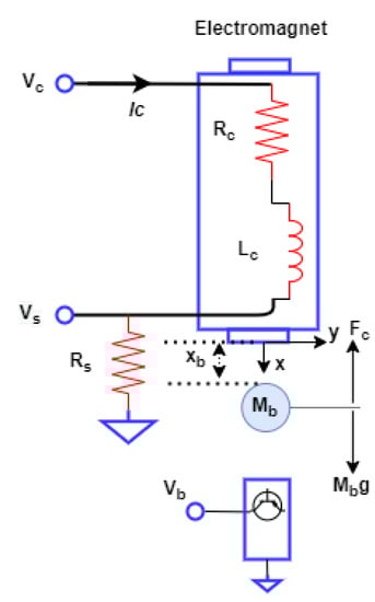 We simulate the proposed algorithm for the prototype structure of the voltage-controlled MLS as shown in Figure 2 based on the levitation of a steel ball in which its position () is detected by the position detector and controlled by regulating the coil voltage (). The electromagnet is presented by a series combination of coil resistance () and coil position-dependent inductance ().