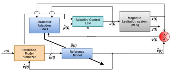 The fundamental structure of the proposed algorithm contains (a) a reference model, (b) reference model stabilizer, (c) parameter adaption laws, and (d) adaptive control signals, as presented in Figure 3.