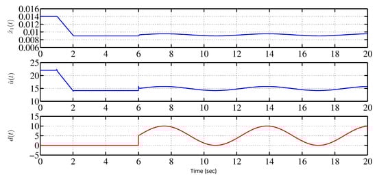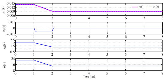 As stated earlier, in a long duration service or due to fault in MLS, the parameters may change. Once the reference system is stabilized around with or without disturbances, the next task is to develop the parameter adaptation laws. This mechanism consists of (a) tracking-error dynamics , (b) parameter estimation dynamics and (c) adaptive control law () for as described in Equations (8)–(10), respectively.