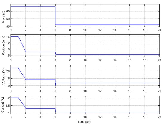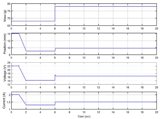 From s, the ball position has been shifted from . Due to change in the stable position, the reference stabilizer has manipulated the coil voltage such that the ball should stay within (0.008–0.010) m and coil voltage should stay within 0–24 V. Hence, the designed stabilizer is capable to achieve the control objectives of the MLS with or without external mismatched disturbances. When sudden change occurs in ball mass, the curves of the coil current and voltage and ball position are depicted in Figure 6 and Figure 7. The sudden change in ball mass up to , ball position, coil current, and coil voltage are still sustained in between its safe bounds. While it is true that sudden change in the mass of the ball is not practically observable in a laboratory setup, like the Quanser Magnetic Levitation systems, we consider such a situation in this simulation study as an extreme condition. The challenge of meeting the control objective is most challenging in such conditions of transience. The simulation results show that the controller design presented is robust to such extreme conditions, as well.