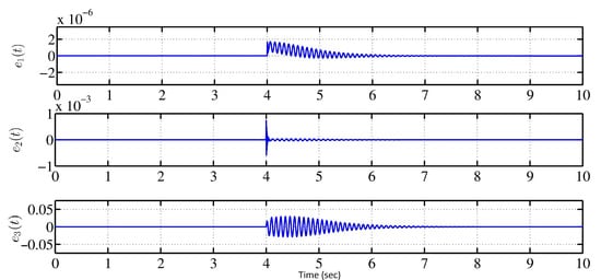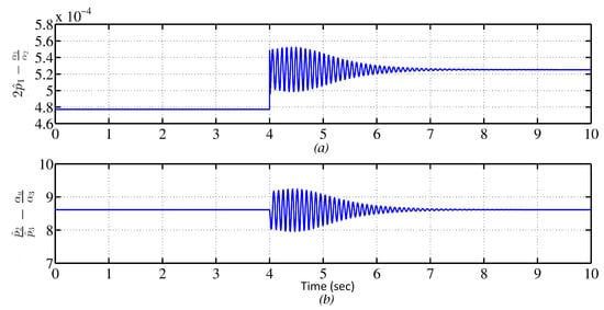 This mechanism is designed such that all the tracking-errors converge to zero asymptotically. In addition, the parameter estimates () converge to the steady-state values within the bounds mentioned in Table 3 and satisfy the constraints obtained in Equations (17) and (19). The Lyapunov stability analysis (Theorem 1) is utilized to obtain the parameter constraints and to choose the tuning parameters (i.e., , ). The chosen values of such tuning parameters are presented in Table 4. Using these values, the tracking-error dynamics are stabilized around zero as shown in Figure 8. There are periodic oscillations and damping in the response of and in the initial phase for 2 to 3 s from . This phenomenon can be co-related with the nonlinear second-order under-damped nature of the mechanical sub-system of the MLS []. The proposed controller can adapt to the change, which is introduced at 4 s and ensures convergence of the error between the two responses to zero within a short time of 2 s. The error, which was already zero before the change in parameters, re-converges to zero after short transience, thereby demonstrating the controller’s robustness, as shown in Figure 8. That is, the tracking error is dynamically stable around the 0, and it is at zero except for a brief period of transience immediately following the change in parameters.