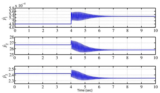 It is equally important to get the bounded steady-state response of the estimated parameters () of the reference model. Hence, using the heuristic approach and the knowledge of the MLS, the parametric update laws in Equation (9) and the control law in Equation (10) have been tuned. The response of estimated parameters are shown in Figure 9.