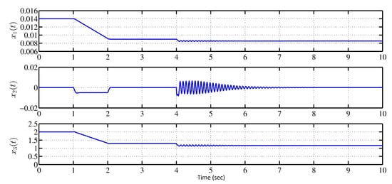 Next, we carry out simulation for the proposed adaptive control environment in the MLS (5) with matched (i.e., ) and mismatched (i.e., ) parametric uncertainties using MATLAB/SIMULINK platform. It is reported in various sources [,] that the level of uncertainty in and may be , , and , respectively. The nominal values and the safe bounded values (i.e., maximum and minimum) due to change in operating conditions (i.e., , , , ) are mentioned in Table 3. For this study, the uncertainties are introduced simultaneously in all the parameters (i.e., , and ) with the magnitude of , and , respectively, at s.