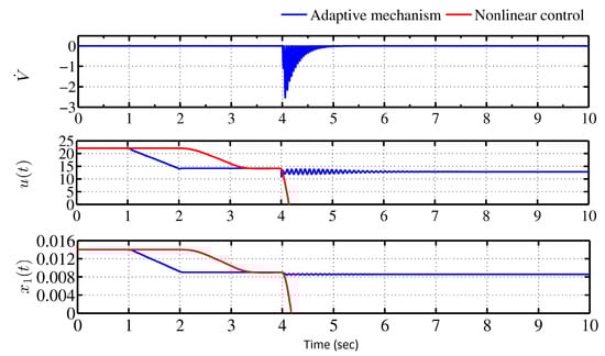 Finally, the system (5) is tuned with one of the widely used Feedback Linearizing Control (FLC) approach for the nonlinear dynamical MLS with the lumped parametric uncertainties. The nonlinear controller (i.e., FLC) fails to regulate the MLS. The comparative response of the steel-ball position and control action using the adaptive mechanism and the nonlinear control are shown in Figure 12. The nonlinear control approach has shown permanent failure in regulating the MLS via coil-voltage. However, the proposed adaptive mechanism has retrieved the ball’s stable levitation around the reference position (r = 0.009 m) by manipulating the coil-voltage, in the presence of uncertainties (including abrupt ones) shown in Figure 10.