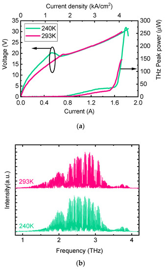 Properties of THz DFG (difference-frequency generation) sources at 240 K and 293 K: (a) Current-voltage-THz output power characteristics; (b) THz spectra.