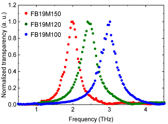 Figure 2 shows transmission spectra of BPFs having different central transmission frequencies, namely, 2.0 THz, 2.5 THz and 3.0 THz (FB19M150, FB19M120 and FB19M100, respectively, Thorlabs, Inc., Newton, NJ, USA), obtained by a THz time-domain spectroscopy system. The average frequency bandwidth was about 0.4 THz (FWHM). To obtain the far-field profile of the devices, we used two-axis motorized XY translation stages. A Golay-cell detector (active area diameter of 6 mm) was mounted on the translation stages at a distance of about 59 mm from the DFG source. We obtained far-field profile along the emission plane. Two-dimensional (2D) scans (62.5 mm × 62.5 mm) were performed with intervals of 1.25 mm. To map the far-field profile at each frequency, we mounted one of the BPFs onto the detector. Total power transmittance of BPF was estimated to be about 21%, 27% and 38% (2.0 THz, 2.5 THz and 3.0 THz, respectively).