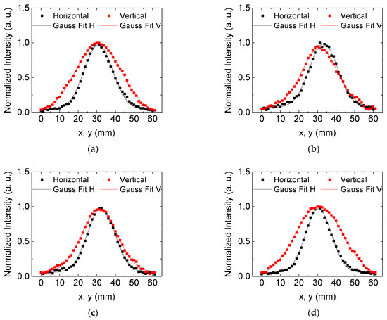 Horizontal and vertical sections of the beam profiles: (a) Using detector without BPF; (b) With 2.0 THz BPF; (c) With 2.5 THz BPF; (d) With 3.0 THz BPF.