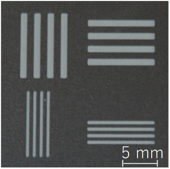We demonstrated imaging of a metal test object having bar pattern slits, at each frequency band (2.0 THz, 2.5 THz and 3.0 THz). We fabricated a test object presented in Figure 6. The upper part of the test object had 1 mm-wide slits, and the lower part had 0.5 mm-wide slits. THz images were obtained with scanning steps 0.2 mm. Figure 7a shows a THz image obtained using the DFG source alone, without a BPF. The imaging results at the individual frequencies (2.0 THz, 2.5 THz and 3.0 THz) are shown in Figure 7b–d. At all the frequencies, both the vertical and horizontal slits could be resolved. By using the knife edge method, the beam diameter at the focusing point in the transmission imaging system was found to be <0.7 mm at all frequencies, with negligible astigmatic difference at each frequency. Although the spatial resolution should be about <0.35 mm considering the beam spot size, we considered that the actual spatial resolution was about 0.4 mm because the image was obtained with a 0.2 mm scan pitch. Therefore, the 0.5 mm-wide slits could be resolved.