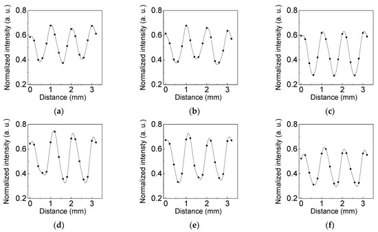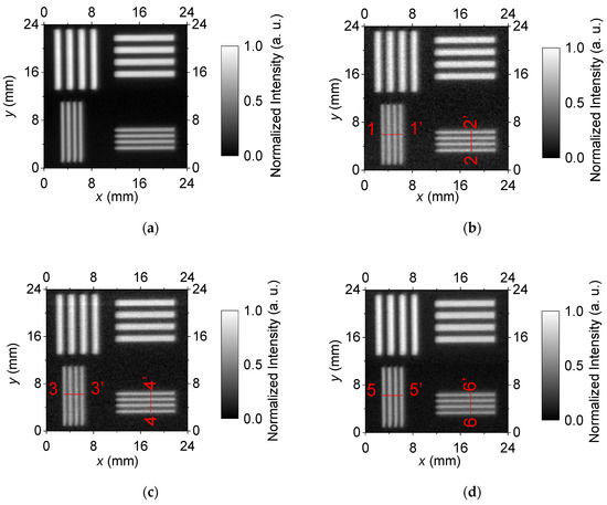 Figure 8a–c depict the line scans extracted from the image along the horizontal solid lines, as shown in Figure 7 (1-1′, 3-3′, 5-5′). Figure 8d–f depict the line scans extracted from the image along the vertical solid lines, as shown in Figure 7 (2-2′, 4-4′, 6-6′). The modulation depth M is calculated according to