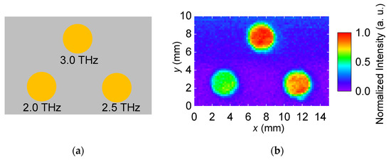 Terahertz (THz) wave (0.3–10 THz) has been used to demonstrate imaging of objects that are opaque at optical frequencies. There are many imaging applications in this frequency region [1,2], including medical [3,4], security screening [5], nondestructive testing for industrial materials [6,7,8,9] and historical arts objects [10,11,12]. THz spectroscopic imaging is expected to be a useful technique for chemical recognition, such as quality control in the pharmaceutical industry, because intermolecular vibrations in some chemicals and organic molecules appears in the THz region. There are many fingerprint frequencies in the 1–4 THz range, and therefore, this frequency range is suitable for chemical recognition.