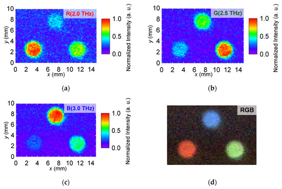 Image of frequency-dependent test object (Figure 9a), images of the test object at 2.0 THz, at 2.5 THz, and at 3.0 THz; (a) Image of the test object at 2.0 THz; (b) image of the test object at 2.5 THz; (c) image of the test object at 3.0 THz; (d) false-color R, G, and B images of the test object.