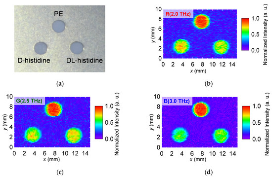 (a) Photograph of three kinds of tablets (Polyethylene (PE), D-histidine and DL-histidine); (b) Terahertz images at 2.0 THz; (c) Terahertz images at 2.5 THz; (d) Terahertz images at 3.0 THz.