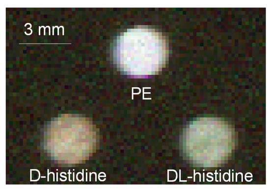 As shown in Figure 12, PE appears as white since it has almost equal transparency in all channels. D-histidine appears as red-white because it has high absorption in the green and blue channels. Additionally, DL-histidine appears as blue-green because it has absorption in the red channel. Thus, from the false-color RGB image obtained with our spectroscopic imaging system, we could distinguish a crystalline sample and its racemate sample.