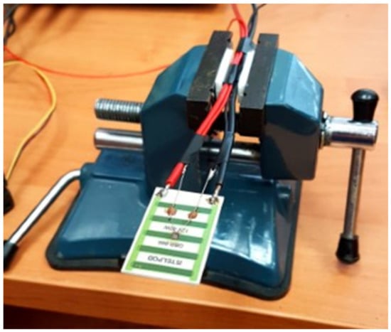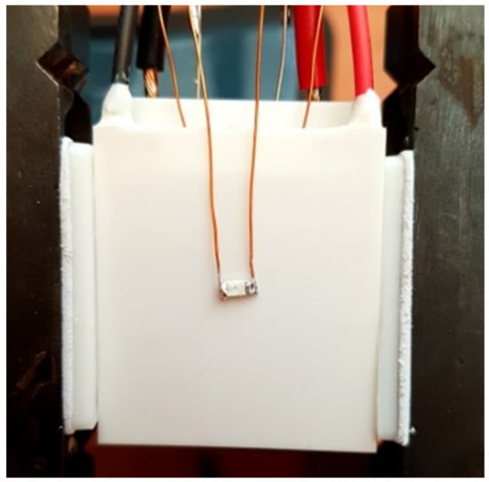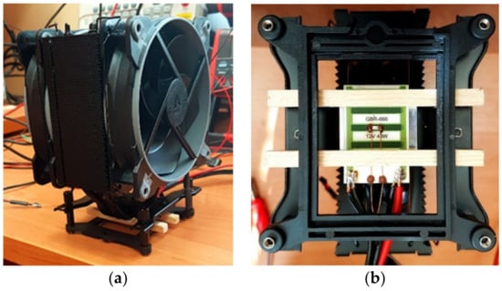 In cooling systems D and E, the Peltier module (Ferrotec Nord, Moscow, Russia) TM–71-1.4-8.5MS was used. According to the producer’s data [51], the dimensions of this module are 30 mm× 30 mm × 3.4 mm, whereas the maximum feeding current Imax = 8.5 A, the maximum feeding voltage Vmax = 8.2 V, the maximum dissipated power Pmax = 41.8 W, and the maximum difference in temperature between the two module sides ΔTmax = 71 °C. In systems B, D, and E, a double-side self-adhesive thermoconducting pad, THERMOPAD-6X1X30 (TME, Łódź, Poland) [52], with thermal conductivity λ = 6 W/(m∙K) was used. The pad is 1 mm thick (d = 1 mm), and its nominal thermal resistance can be computed using the following formula: