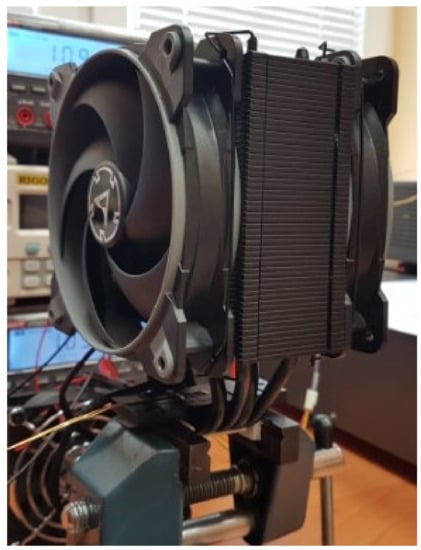 In general, cooling methods may be divided into two groups—passive (free cooling) and active (forced cooling) [16]. Free cooling methods use heat sinks, heat pipes [18,19,20], vapor chambers [18,20,21,22,23,24,25,26], liquid chambers [27], and various types of thermal interfaces —thermoconducting pastes, glues, pads, gels, and phase change materials [28,29]. Forced cooling methods mostly make use of fans, but also, liquid cooling systems [30,31,32,33,34] and thermoelectric (Peltier) modules [35,36] are used.