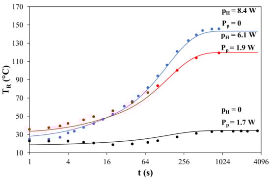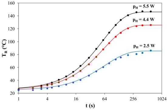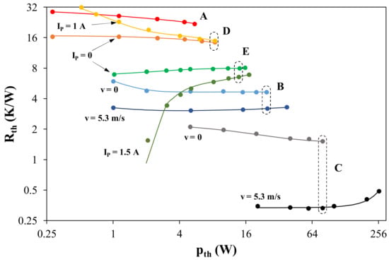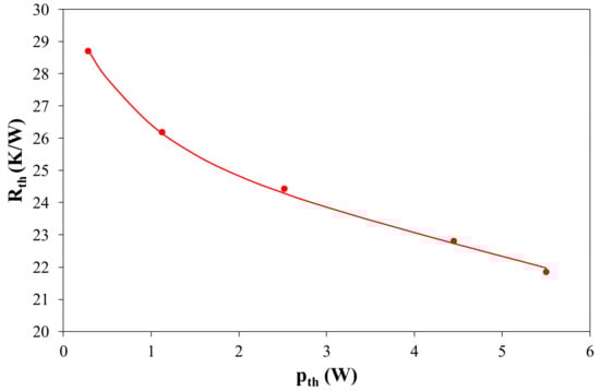 Figure 8, Figure 9, Figure 10, Figure 11, Figure 12, Figure 13, Figure 14 and Figure 15 present the measured (points) and modelled (lines) dependences Rth(pth) for all the considered cooling systems. The modelled curves are obtained using the estimated values of the model parameters.