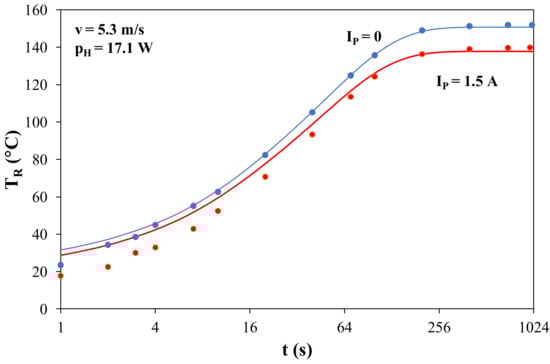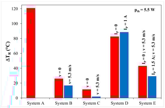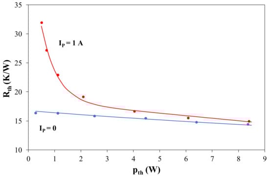 Figure 9 presents the measured and modelled dependences of the thermal resistance of the resistor attached to the cold side of the Peltier module with the use of a thermal pad (system D). This figure shows also an influence of the power dissipated in the Peltier module on the thermal resistance of the investigated resistor. The results obtained for the Peltier module with no supply (IP = 0) are marked with blue color, whereas the results for the module’s current IP = 1 A are marked with red color.