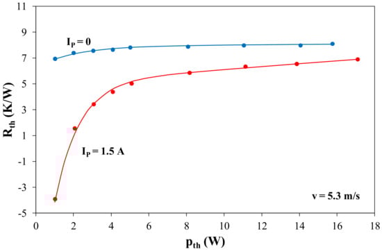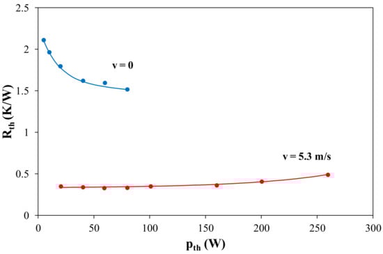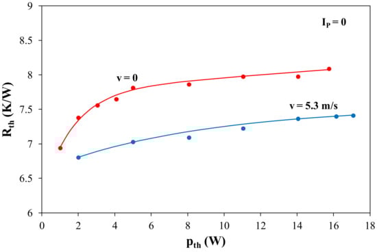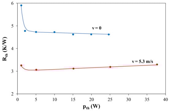 The presented dependence Rth(pth) is a decreasing function in the whole range of power pth when the cooling system operates in the natural convection (v = 0) conditions, whereas at operation in the forced convection conditions (v = 5.3 m/s), an increasing function Rth(pth) is obtained for power pth > 3 W. Such a character of Rth(pth) changes indicates that in the natural convection conditions, heat convection has a dominant influence on thermal resistance, but in the forced cooling conditions, it is heat conduction. It is worth noting that applying forced cooling allows the lowering of the thermal resistance of the resistor even by 35%.