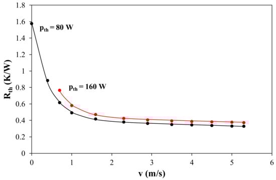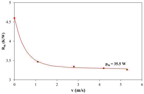Figure 11 presents the dependence of the thermal resistance of the resistor incorporated into the investigated cooling system on the airflow speed at power pth = 35.5 W dissipated in the resistor.
