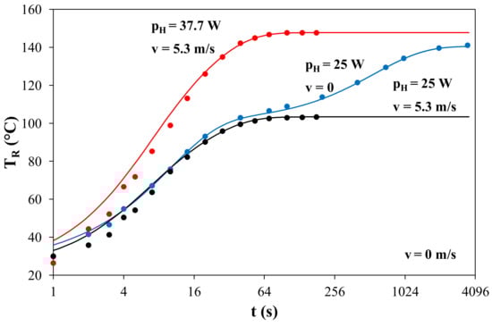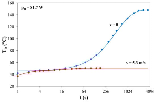 Figure 12 and Figure 13 illustrate the thermal properties of the investigated resistor cooled by an active heat sink. As the thermal interface between the resistor and the heat sink, the silicon paste is applied (system C). In Figure 12, the dependence of the thermal resistance of the resistor operating in this cooling system on the power generated in it at two values of airflow speed v equal to 0 and 5.3 m/s is shown.