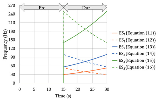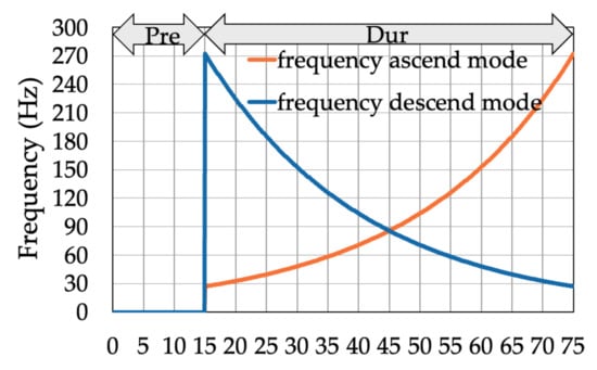 Second, the method used to apply local vibratory stimulation to the poor proprioceptor is explained. The local vibratory stimulation was applied to the poor proprioceptor for 1 min because a 1 min vibration was used to evaluate the effect of vibration in a previous study [34]. Patients with NSLBP were instructed to remain still and relaxed in a sitting position. The vibration frequency (Figure 4) was used to cover the response frequency ranges of the poor proprioceptor. Based upon which proprioceptor is declined, the relationships between frequency f(t) and measurement time t are shown in Equations (8)–(10), respectively. As shown in Figure 4, the frequency of the vibratory stimulation rises in 30 s and falls in 30 s to give the stimulation to each proprioceptor over the entire response frequency range. The sweep frequency was approximated as linear because the vibration that stimulates each frequency range in 30 s changes very slowly.