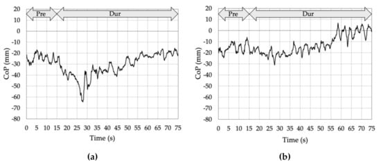 Results of CoP displacement of the patient 6 in the anteroposterior direction: (a) CoP displacement when the vibratory stimulation was applied to the GS; (b) CoP displacement when the vibratory stimulation was applied to the LM.